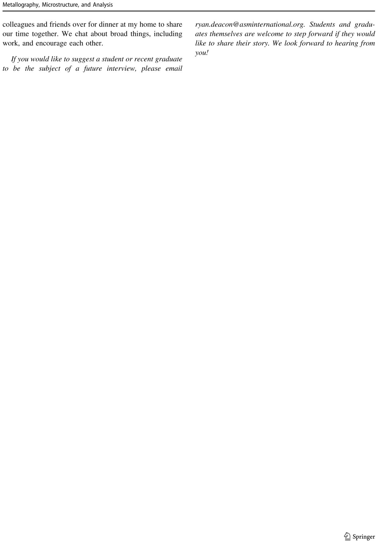 国际杂志《Metallography, Microstructure, and Analysis》对我院博士生季洪梅同学进行了采访,并以“Dialogue with Emerging Engineers”(对话新兴工程师)为题,将专访发表在该期刊上。