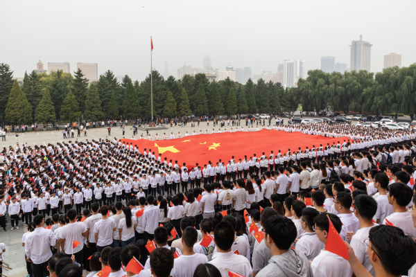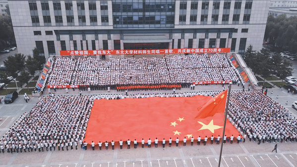 主题教育活动在高昂的国歌中拉开序幕,随后全体师生共同唱响《我和我的祖国》和《东北大学校歌》,并跟随旋律摆动国旗,祝福祖国日益繁荣昌盛、国富民强。学院2019级硕士生党员自学手语,表达对祖国祝福和热爱。80名2019级本科生,在知行广场中央跟随旋律抖动长30米、宽近20米五星红旗,将现场气氛推向高潮。活动最后,广大师生用“点赞祖国、爱我东大”材料人共同的心声向祖国母亲告白,回声响彻东大上空。