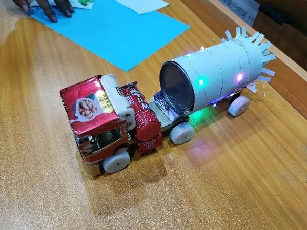 作品描述:用废弃易拉罐制作运动小车,体现金属再循环理念,为环保加油,为祖国加油!