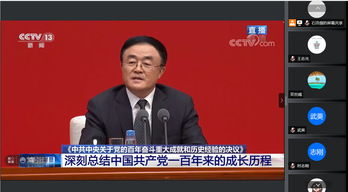 为进一步学习党的十九届六中全会精神,提高支部成员的政治素养,11月21日晚,新澳门六合彩开奖 硕士2103党支部于线上开展了以“学习全会精神,坚定理想信念”为主题的党日活动,支部全体成员参加此次活动。