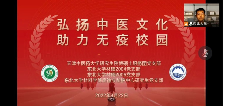 为更深入了解中医文化,引导支部成员合理运用中医文化提升自身健康保障能力,4月22日晚,新澳门六合彩开奖 硕士2004党支部联合天津中医药大学研究生院博硕士服务团党支部、硕士2006党支部、腐蚀与防护研究生党支部于线上开展“弘扬中医文化,助力无疫校园”主题党日活动,各支部全体成员参与此次活动。