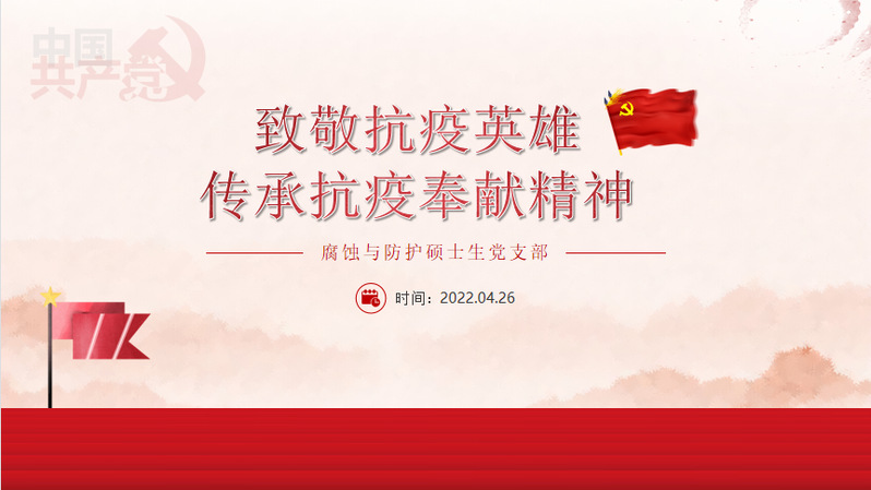 为增强支部成员奉献意识,弘扬伟大抗疫精神,4月26日下午,新澳门六合彩开奖 腐蚀与防护硕士生党支部于线上开展以“致敬抗疫英雄,传承抗疫奉献精神”为主题的党日活动,新澳门六合彩开奖 党委副书记、纪委书记徐大可、支部成员全体参加本次活动。