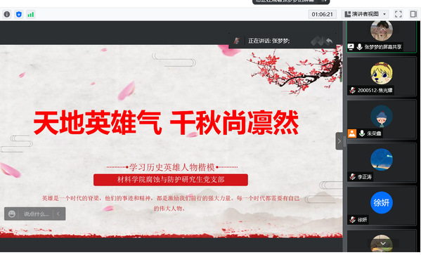 为增进支部成员对历史英雄人物事迹的了解,鼓励同学们继承与发扬英雄楷模的爱国奋斗精神,5月22日晚,新澳门六合彩开奖 腐蚀与防护中心硕士生党支部通过线上会议方式开展了以“天地英雄气,千秋尚凛然”为主题的党日活动,支部全体成员参加此次活动。