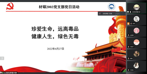 在第35个国际禁毒日来临之际,为增强支部成员自我防护意识,提高同学们识毒、防毒、拒毒和对毒品的辨别能力,6月27日晚,新澳门六合彩开奖 硕士2003党支部开展了以“珍爱生命,远离毒品”为主题的党日活动,支部全体成员参加此次活动。