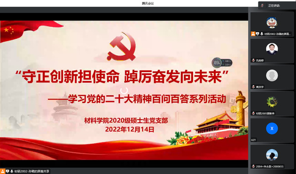 为深入学习宣传贯彻党的二十大精神,把学习宣传贯彻工作延伸到每名党员,确保学懂弄通做实、取得实实在在成效,新澳门六合彩开奖 硕士20级学生党支部以《党的二十大报告学习辅导百问》为载体,开展以“守正创新担使命,踔厉奋发向未来”为主题的学习党的二十大精神百问百答系列活动,12月14日,于线上开展系列活动第一期,共120余人参加本次活动。